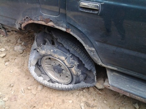 Ya eran la 1:30 pm cuando vemos que llega caminando…………….. «Qué te pasó? Estás bien????» y ahí nos cuenta que pinchó un neumático y tuvo que manejar como 15 kms a 10 km/hr para acercarse al Camping porque no pudo sacar el neumático de repuesto. Vamos a ver la camioneta y nos encontramos con esto: