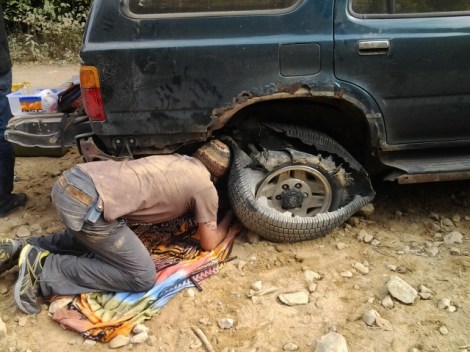 Quéeeeeeeeee???? Nunca en mi vida había visto un neumático tan hecho mi**da… Bueno, ahora tocaba la misión de cambiarlo! Los chicos se tiraron al suelo a luchar contra la rueda de repuesto que estaba oxidada y muy apretada. Después de varios minutos (VARIOS) lograron sacarla! Excelente! Ahora sólo hay que reemplazarla!