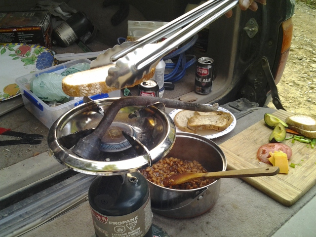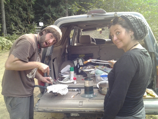 Al día siguiente en la mañana (jueves), Lance salió en la camioneta a buscar señal porque necesitaba hablar con su viejo con urgencia. Nosotros nos levantamos como a las 11 y nos encontramos con que el café, pan, huevos, cocinilla, todo, TODO estaba en la camioneta! Como hay osos por acá no se puede dejar nada a mano… en fin, a esperar a Lance!