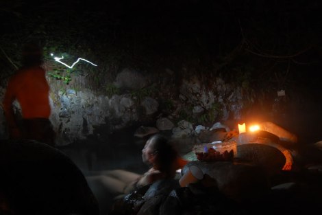 Llegamos cerca de las 5, armamos el camping y cocinamos unos tallarines pa matar el hambre. Ya con la «guatita llena», pescamos un par de chelas, linternas, toallas y bajamos a las termas!